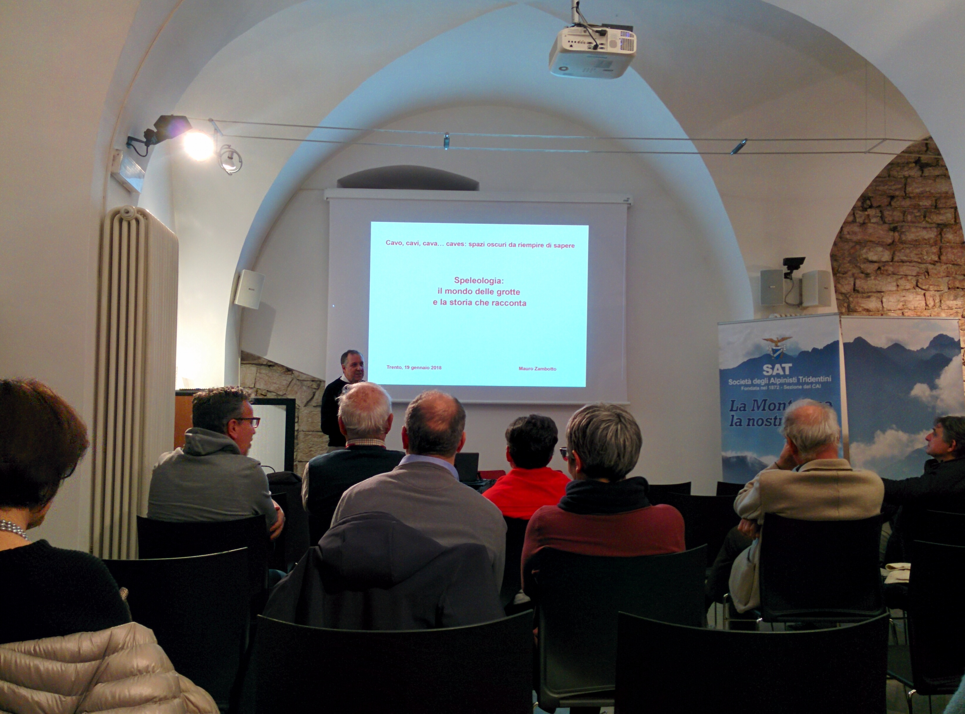 Marco Ischia, speleologo e scrittore, ha proposto una digressione sulle vicende della speleologia trentina, raccontando le storie dei personaggi, delle ricognizioni e dei siti; Mauro Zambotto, sostituto dirigente del Servizio Geologico della Provincia autonoma di Trento, ha illustrato le principali tematiche connesse con l'esplorazione e lo studio scientifico delle grotte naturali in ambiente carsico, con particolare riferimento al territorio trentino. Insomma, ha raccontato ciò che la speleologia può svelare in campo scientifico e antropologico. L’ultimo appuntamento è stato affidato a Francesco Luzzini, naturalista e storico della scienza, che nell’“esplorazione speleologica in età moderna” ha tratteggiato quella luminosa esplosione di sapere che coinvolse, in un’epoca in cui i confini tra i saperi erano spesso labilissimi, scienza e filosofia, storia, geografia, letteratura, archeologia, antropologia e folclore.