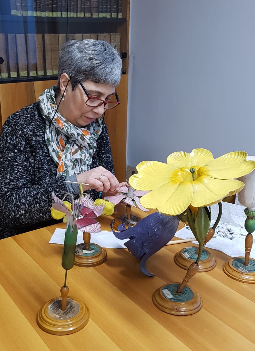 I modelli Brendel che vedete nelle immagini sono esposti nelle sale della mostra Ci vuole un fiore e fanno parte della collezione del Liceo Prati di Trento. In una delle foto la nostra restauratrice, Paola Conzatti, impegnata a pulire i modelli nelle settimane precedenti l'inaugurazione della mostra.